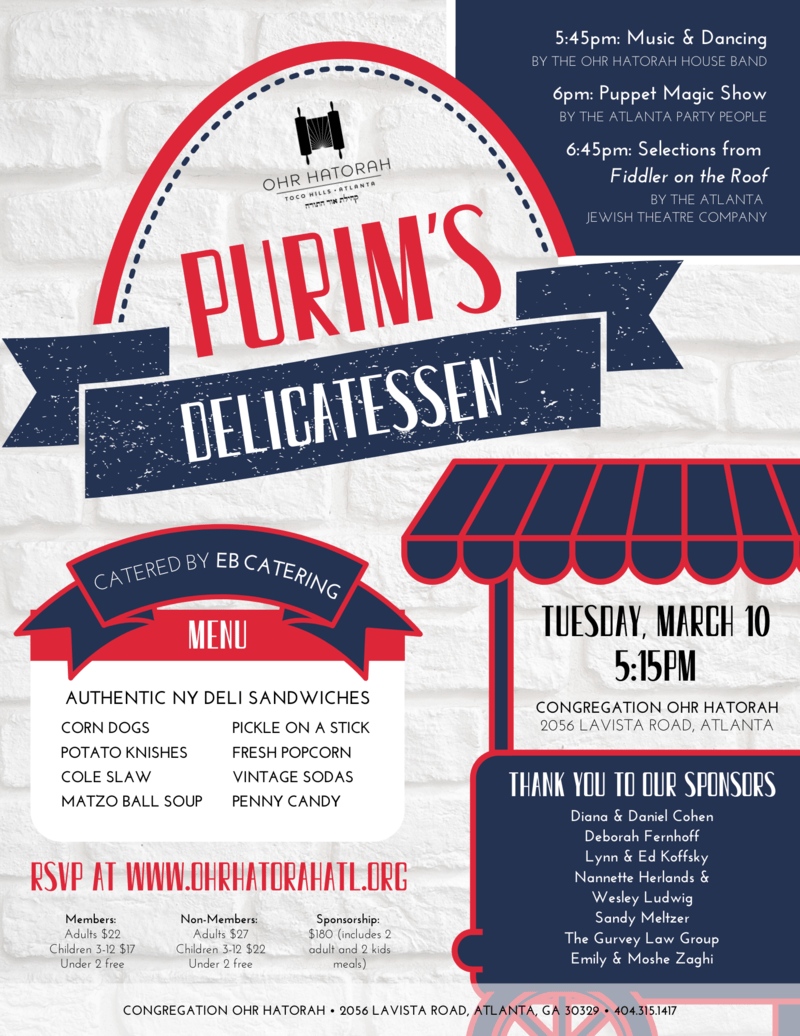 The Atlanta Jewish Theatre Company is performing at 6:45pm on March 10 for Ohr Hatorah’s Purim’s Delicatessen.